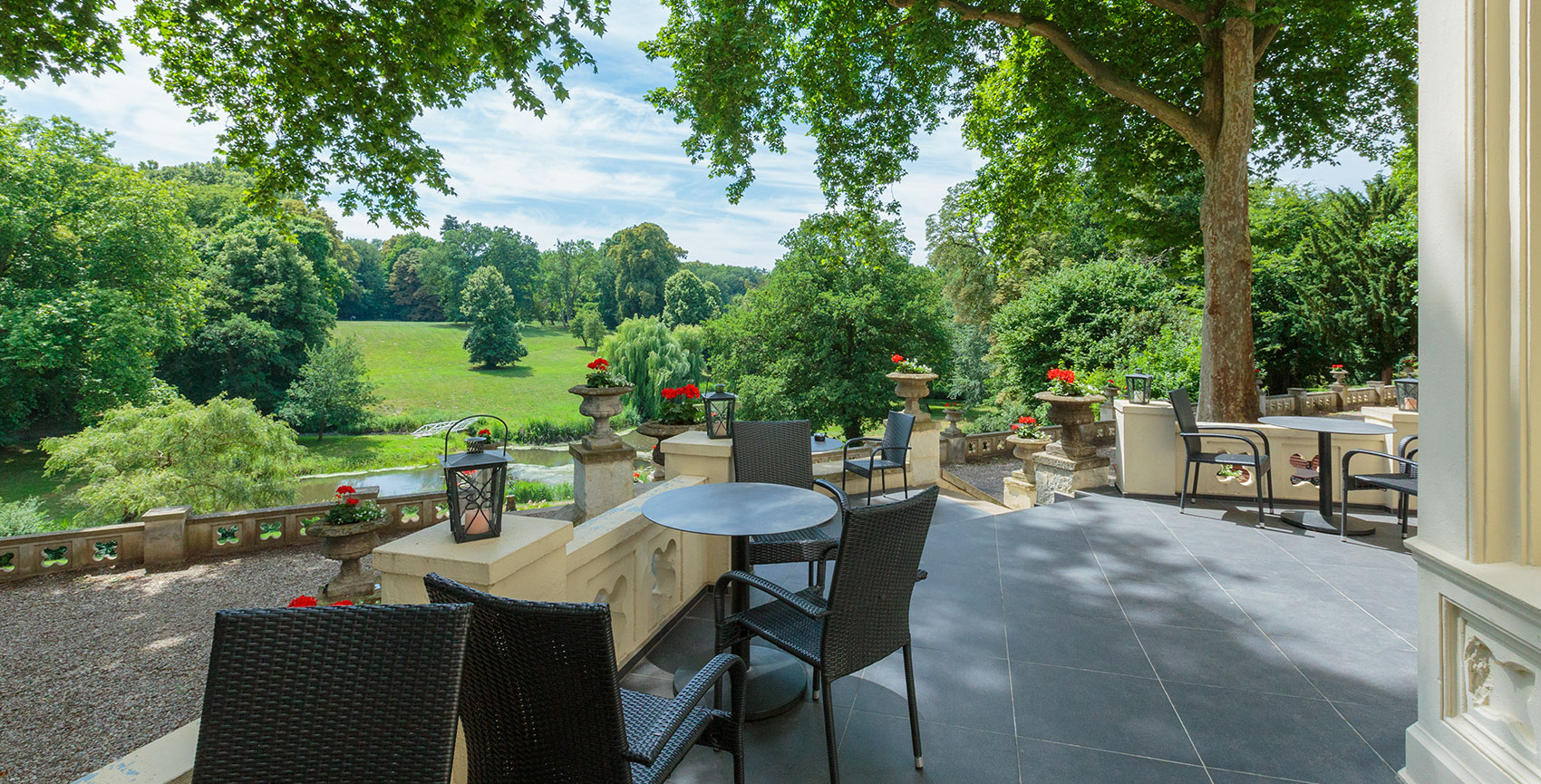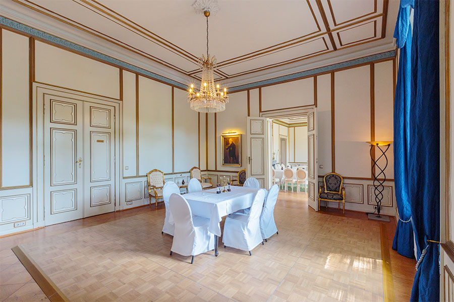 Der Englische Salon verbindet den Gartensaal, unseren Bankettsaal, mit der Orangerie und eignet sich bestens für Veranstaltungen kleinerer Art. Bei größeren Hochzeiten wird er gern als Tanzlocation genutzt.